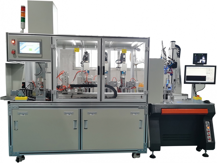 用于自动调整空调电子膨胀阀的开阀脉冲,由人工上料后启动自动调整程序,设备自动完成膨胀阀的预开关阀、步进调节等,到达开阀脉冲点后自动压合外壳,并可编辑压合外壳后的开阀等动作。